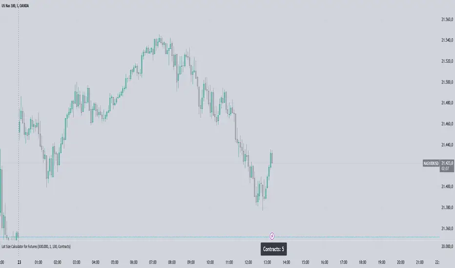 Easily and quickly calculate lot sizes with this unique indicator for futures trading. Whether you're dealing with full contracts or micro contracts, this tool simplifies the process by allowing you to input your account balance, risk percentage, and stop loss in pips. The indicator then automatically calculates the optimal number of contracts to trade based on your risk parameters. Designed for both novice and experienced traders, it ensures precise risk management and enhances your trading strategy. Experience the ease and efficiency of lot size calculation like never before!