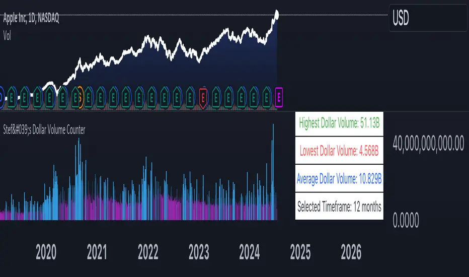 2. Dollar Volume Counter Table: Positioned at the bottom right of the chart, this table provides quick insights into the highest, lowest, and average dollar volumes over a specified period. You can customize the time period in the settings menu.