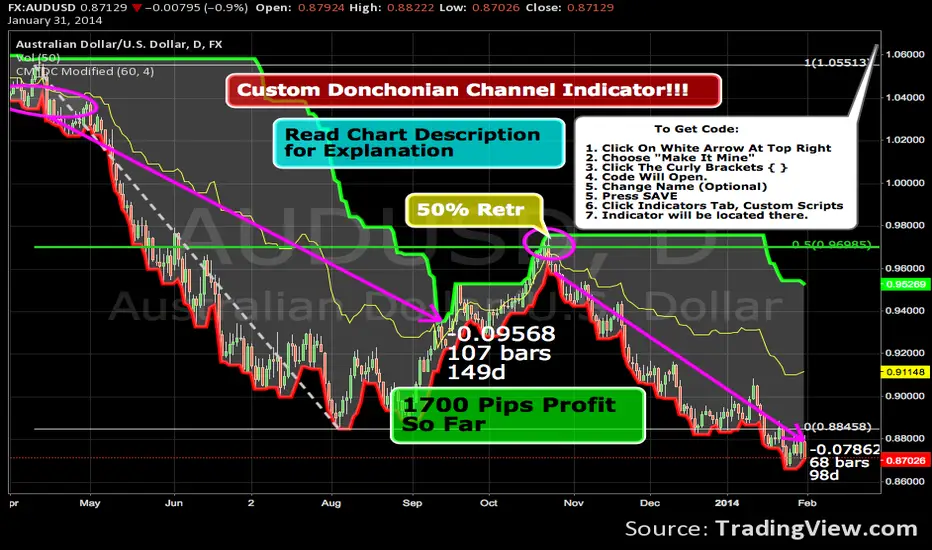 Mentor of mine (Mark Helweg) who ran a successful Hedge Fund, and has won several Awards for Quantatative Analysis conducted a free webinar that blew my mind. We’ve all heard most successful Traders make the most money on 5% of their trades. The reason is simple. To make BIG Money You Have to Catch BIG MOVES in the market. Do You Have A system That Get’s You In To Trades With LOW Risk, But Also Has Rules Built In To KEEP You In A WINNING TRADE? Well He Gave Me His System So I Coded It and I’m Passing Along to You….Trade Rules Will be in the First Post. INDICATOR - Donchian Channel that allows you to pick different Periods for the Upper and Lower Band. Read The First Post For an Explanation…..