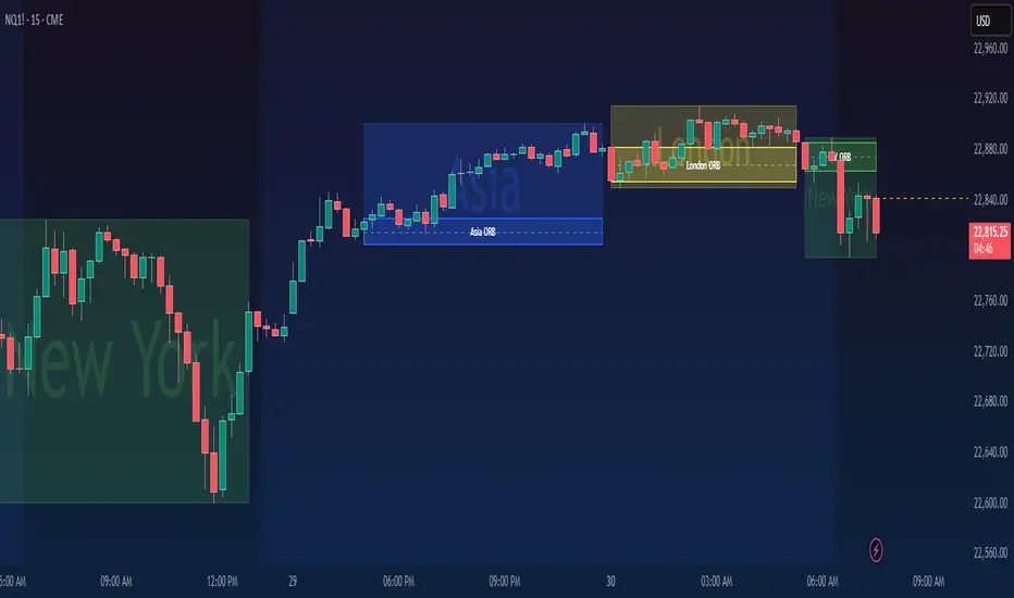 This indicator plots Opening Range Breakouts (ORBs) and major Killzone sessions (Asia, London, New York) on one chart.