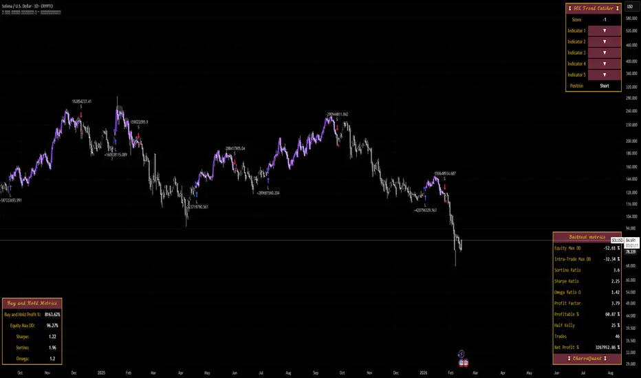 ⏳ 𝓢𝓞𝓛 𝓣𝓻𝓮𝓷𝓭 𝓒𝓪𝓽𝓬𝓱𝓮𝓻 ⏳ is a Trend Following algorithm designed specifically to capture Solana’s sustained directional moves on the daily timeframe.