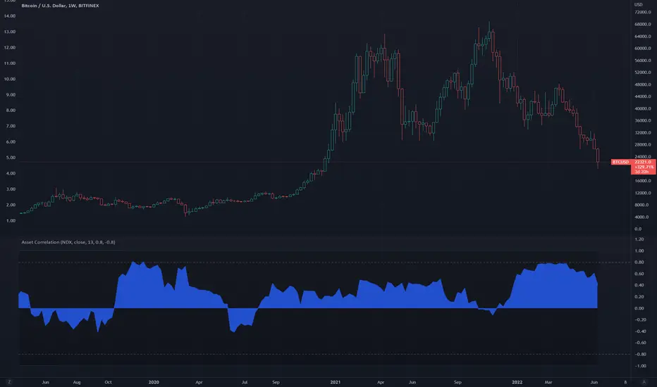 This indicator shows correlation strength between the source asset plotted in the main chart and a user-input asset in the indicator panel. For example, if the main chart panel is displaying BTCUSD and the correlation indicator is NDX, then the correlation strength is plotted as the relationship between the two. A strong positive correlation target is set at 0.80 but can be changed. A strong negative correlation target is set at -0.80 and can also be changed.