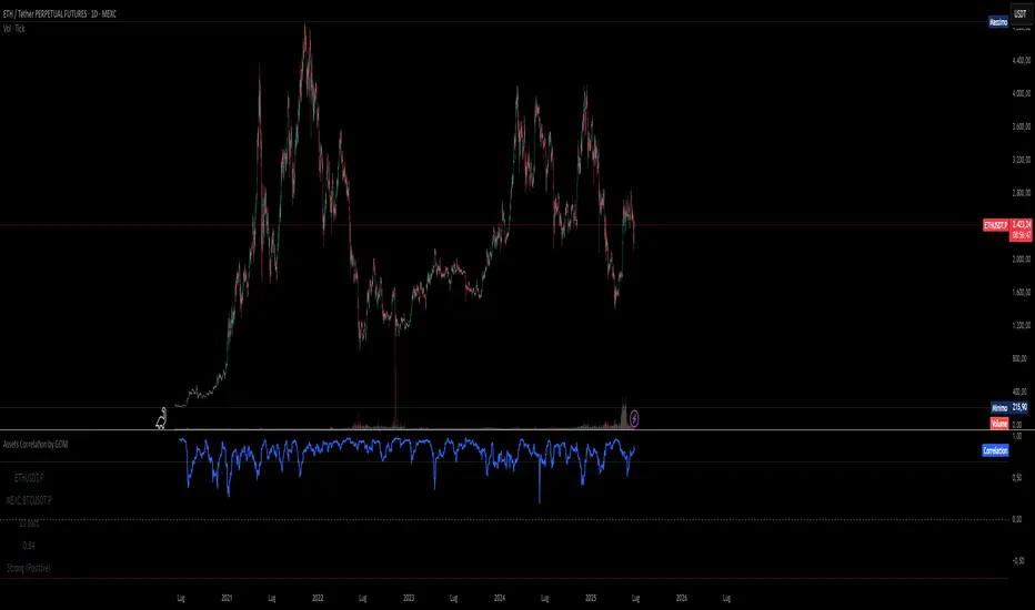 This indicator calculates and displays the rolling correlation between the asset on your chart and a second asset of your choice. The correlation is computed based on log returns over a user-defined lookback period. A live summary table appears in the bottom left corner, providing a real-time snapshot of the current correlation and its context.