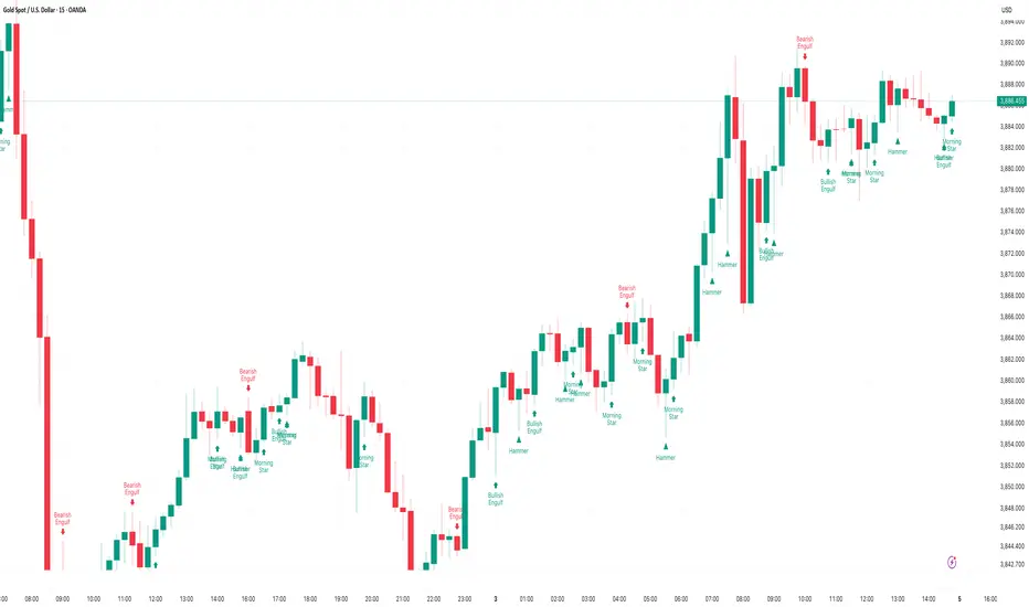 - 🟢 Bullish patterns appear below candles (possible buy/reversal areas).