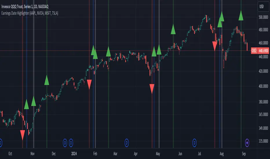 This indicator, called "Earnings Date Highlighter," is designed to visualize earnings data for up to four different stocks on a single chart. It's particularly useful for traders or investors who want to track earnings events for multiple companies simultaneously, such as the top holdings of an ETF.
