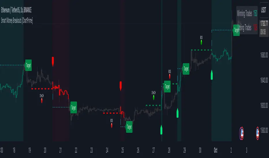 The "Smart Money Breakouts" indicator is designed to identify breakouts based on changes in character (CHOCH) or breaks of structure (BOS) patterns, facilitating automated trading with user-defined Take Profit (TP) level.
