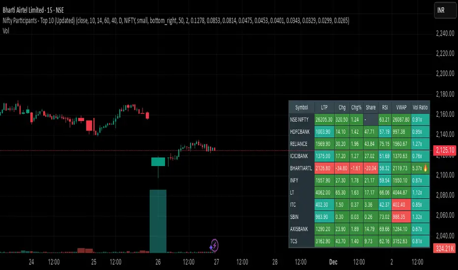 This indicator displays the top 10 weighted stocks from the NIFTY index and shows how each stock is contributing to the index movement in real time.