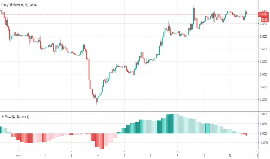 Indicator is designed for 1 hour time-frame and it shows the value of 4 hour MACD histogram