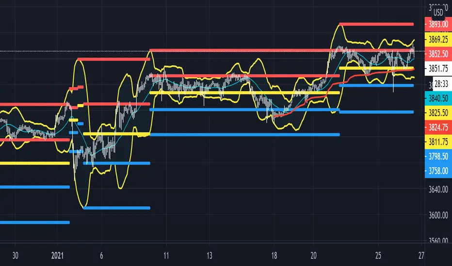 Beacon uses the current volatility of the market based on your trading time frame to determine support and resistance levels, whether a trend is intact or ready to revert back in the range. One of the most difficult things I went through as a trader was determining whether we are in a trend day or if we are in grind up or grind down mode. I created Beacon to give me a simple look at the market to determine what type of environment we are in. I use Bollinger Bands (3 standard deviation) to determine the volatility cycle. Once the BB make peaks I took my Fibonacci Retracement tool and did a retracement from the peak high of the BB to the peak low. I use 70%, 50% and 30% for my support and resistance levels. I use those levels because I tested pretty much every percent level and those percentages averaged the highest performance on all tick charts and time charts. You can use Beacon on whatever time frame or tick chart you are trading on and it will determine that specific volatility cycle.