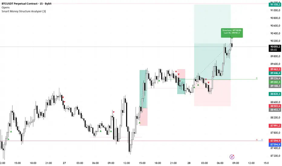 Smart Money Structure Analyzer - профессиональный торговый инструмент, реализующий концепции Smart Money (SMC) для определения ключевых сдвигов рыночной структуры, Break of Structure (BOS) и Change of Character (CHoCH). Индикатор помогает отслеживать поток "умных денег", выявляя паттерны институционального ордерного потока на любом таймфрейме.