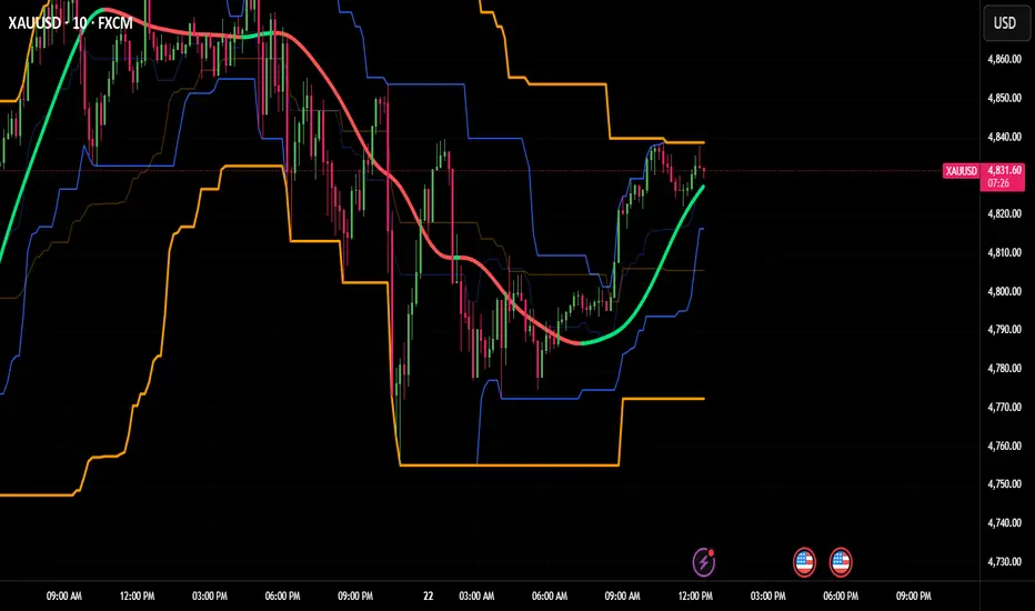 This indicator combines a **Double Donchian Channel** with a **dynamic T3 Moving Average** to provide a clear view of market structure, volatility, and trend direction on a single chart. The **fast Donchian channel** tracks short-term price extremes, making it useful for identifying breakouts, pullbacks, and momentum shifts. The **slow Donchian channel** represents higher-timeframe structure and acts as a dynamic support and resistance zone, helping traders understand the broader trend context and avoid trading against dominant market pressure.
