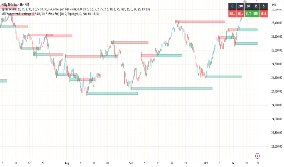 A clean dashboard that tells you whether the same Supertrend (ATR Length, Multiplier) is BUY or SELL across five timeframes—all on one chart. Higher-TF values are fetched with request.security() and, when Confirm HTF bar close is ON, they do not repaint after that bar closes.