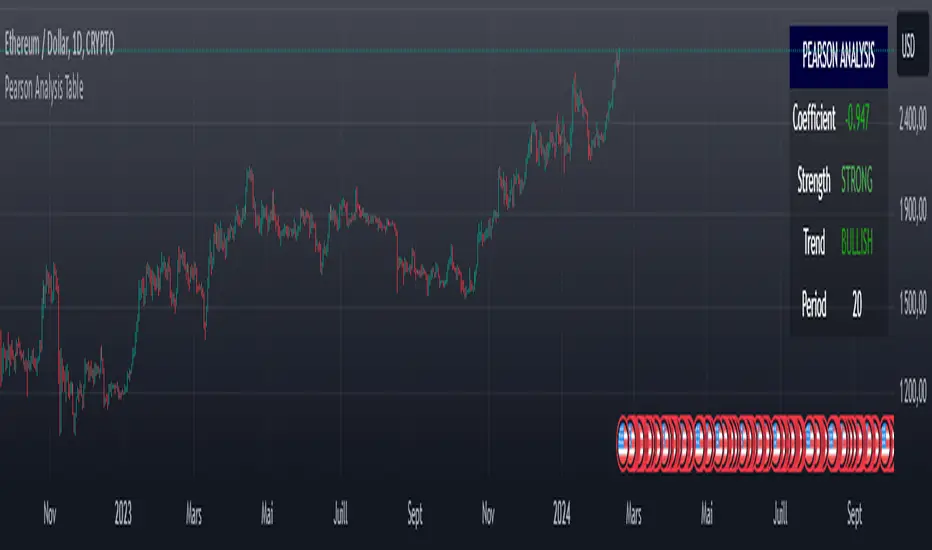 Le composant visuel du script est un tableau statistique dynamique affiché sur le graphique. Ce tableau fournit le coefficient de Pearson actuel, la force de la corrélation (classée comme Forte, Moyenne, Faible ou Neutre), la tendance déduite et la période d'analyse. Les valeurs sont codées par couleur pour une identification facile, améliorant ainsi la compréhension du trader.