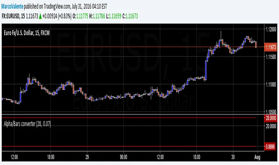 Simple tool to convert alpha in Bars length period. Often MA period's are express in alpha ratio, and become difficult to visualize the MA length's . Now you can convert alpha in to periods, and periods in alpha