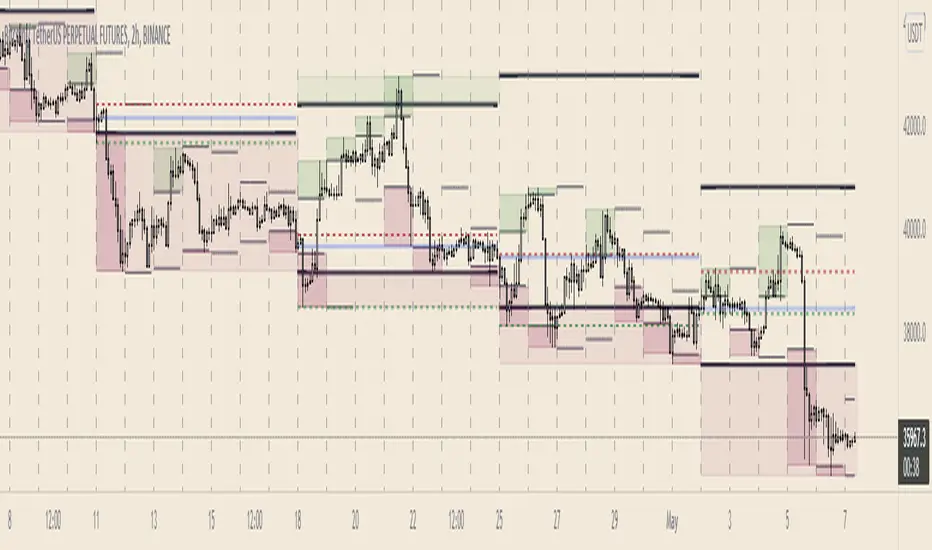 The indicator plots the highs and lows of the previous day and week. On default, it also shows the high and low price for the first 8 hours of the opening day of the week. Users can customise this in settings. The weekly open is also plotted. The background changes colour once a daily/weekly high or low has been breached and stops at the extreme point of price. These areas may provide points of interest in the future.