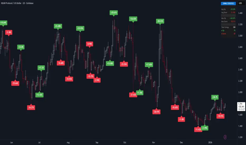 Swing % Visualizer is a clean, intuitive indicator that automatically detects pivot points (swing highs and lows) and displays the percentage change between each swing directly on your chart.