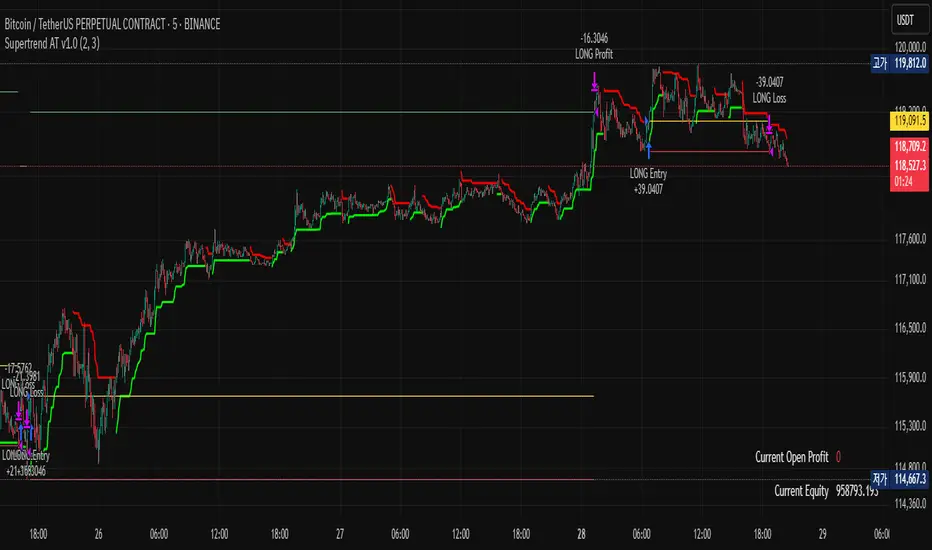"Supertrend AT v1.0" is an automated trading strategy based on the Supertrend indicator, designed to detect trend reversals and execute entries accordingly. This script supports both **long and short** positions and includes customizable risk management features such as **RPT (Risk Per Trade)** and **RR (Risk/Reward ratio)**.