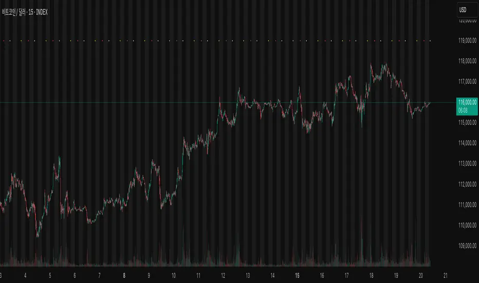 캔들 위에 개장 시간마다 작은 점으로 표시됩니다. (한국시간 기준: 아시아 09:00, 유럽 16:00, 미국 22:00)
