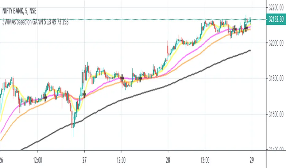 Plots 5 Weighted Moving Averages of 5 13 49 73 198 with source (High+Low+Close)/3
