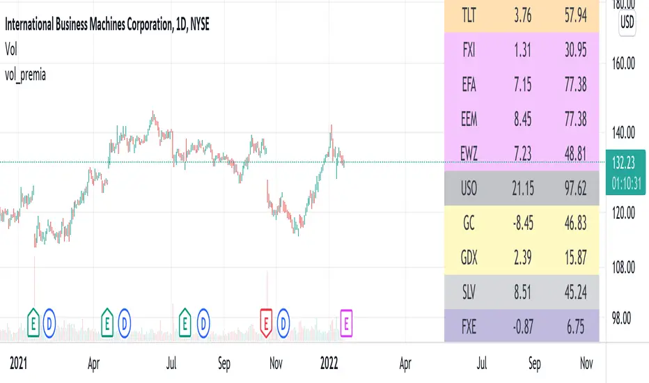 This script shows the volatility risk premium for several instruments. The premium is simply "IV30 - RV20". Although Tradingview doesn't provide options prices, CBOE publishes 30-day implied volatilities for many instruments (most of which are VIX variations). CBOE calculates these in a standard way, weighting at- and out-of-the-money IVs for options that expire in 30 days, on average. For realized volatility, I used the standard deviation of log returns. Since there are twenty trading periods in 30 calendar days, IV30 can be compared to RV20. The "premium" is the difference, which reflects market participants' expectation for how much upcoming volatility will over- or under-shoot recent volatility.
