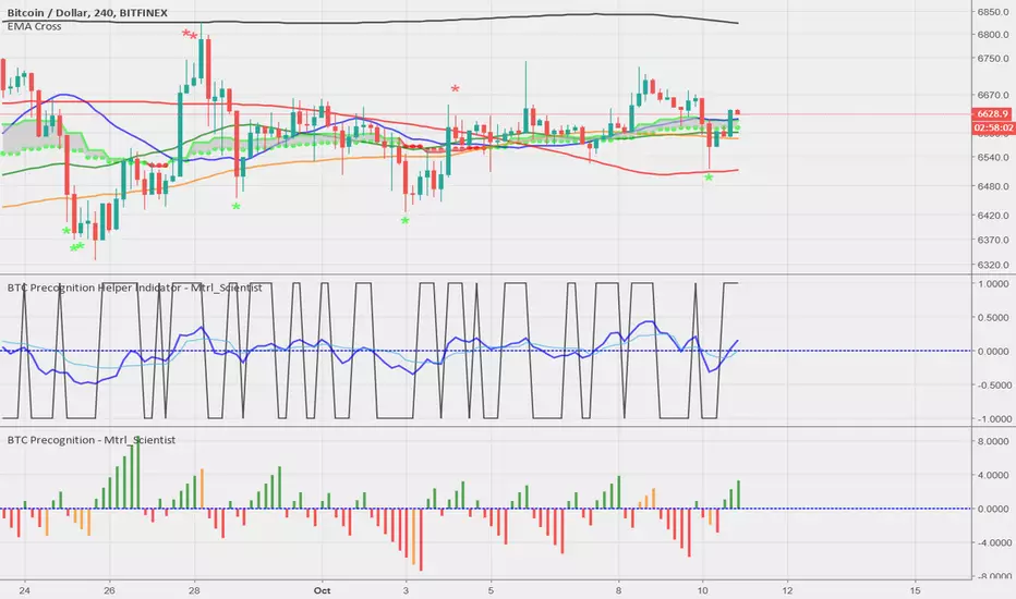 This is the study version of the improved 'BTC - Precognition' algorithm, meaning you'll only see the indicator and not have 'longs/shorts' painted on your chart.