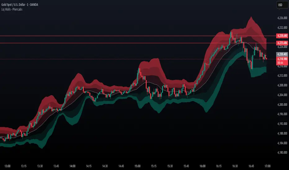 The SMC Statistical Liquidity Walls indicator is designed to visualize market volatility and potential reversal zones using advanced statistical modeling. Unlike traditional Bollinger Bands that use simple lines, this script utilizes an “Inverted Sigmoid” opacity function to create a “fog of war” effect. This visualizes the density of liquidity: the further price moves from the equilibrium (mean), the “harder” the liquidity wall becomes.