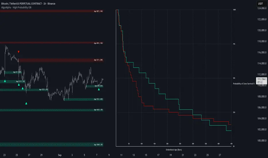 Order blocks are regions of strong institutional interest, often marked by large imbalances between buying and selling. This script identifies those areas using z-score thresholds on directional distance (up or down candles), detecting statistically significant moves that signal potential smart money footprints. A bullish block is drawn when a strong up-move (zUp > 4) follows a down candle, and vice versa for bearish blocks. Over time, each block is evaluated: if price “mitigates” it (i.e., closes cleanly past the opposite side and confirmed with a 1 bar delay), it’s considered resolved and logged. These resolved blocks then inform a Kaplan-Meier-like survival curve, estimating the likelihood that future blocks of a given age will remain unbroken. The indicator then draws a probability curve for each side (bull/bear), updating it in real time.