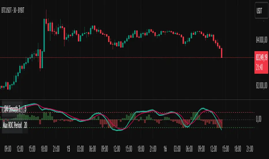 This indicator combines the Rate of Change (ROC) and the Stochastic Momentum Index (SMI) with automatically adjusted parameters for different time frames (short, medium, long). It normalizes the ROC to match the SMI levels, displays the ROC as a histogram and the SMI as lines, highlights overbought/oversold zones and includes a settings table. Ideal for analyzing momentum on different time frames.