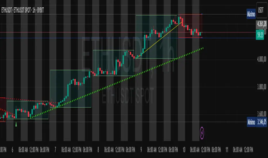 This TradingView indicator, called "Mark 4H Candle Span", serves to **visually highlight alternating 4-hour time blocks** directly on the price chart.It does this by coloring the background of the chart for one 4-hour period and leaving the next 4-hour period uncolored, creating a pattern of vertical stripes.---### How It WorksThe code operates in two main steps:1. **Calculation of the 4-Hour Block**:The line `session_id = math.floor(time("1") / (1000 * 60 * 60 * 4))` calculates a unique identification (ID) number for each 4-hour block.* `time("1")`: Gets the current time (in milliseconds).* `(1000 * 60 * 60 * 4)`: Is the total number of milliseconds in 4 hours.* By dividing the time by the 4-hour interval and rounding down with `math.floor`, the script assigns the same `session_id` to all the candles within the same 4-hour block.2. **Background Coloring**:The line `bgcolor(session_id % 2 == 0 ? color.new(color.blue, 85) : na)` decides whether to color the background.