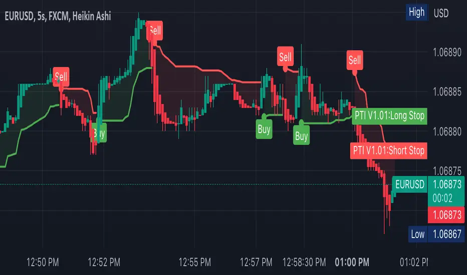 The PTI is a custom indicator designed to provide buy and sell signals based on price movements and volatility. It uses the Average True Range (ATR) to calculate stop levels and identifies potential trend changes.