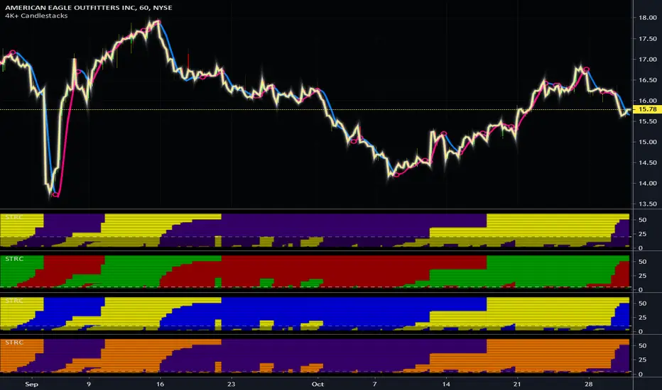 This is my "Simply Trendy RasterChart" using PSv4.0 freely available to ALL! Simply Trendy, shown with the multiple color schemes on the bottom portion of the chart, is an indicator that differentiates with color between trending moments up and down, but is also effective at identifying trend reversals clearly. The bottom of the indicator is most reactive and indicates reversals, while the upper portion of the indicator commonly shows enduring trends. I included a horizontal rule to approximately gauge at what level you may wish to have before entering/exiting a trade upon identifying a trend change. This gizmo functions on all assets on time frames ranging from one second bars up to the "All" chart having monthly bars. Possible uses are quickly identifying assets that are not only opportunistic towards buying, but also selling/shorting when that time arrives later.