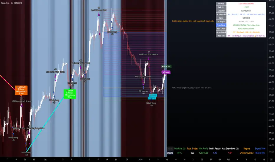 Dynamic profit‑locking and runner management: Multi‑stage profit capture, value‑area reversal exits, nuclear loss clamps, and runner logic tuned by volatility and liquidity regime.