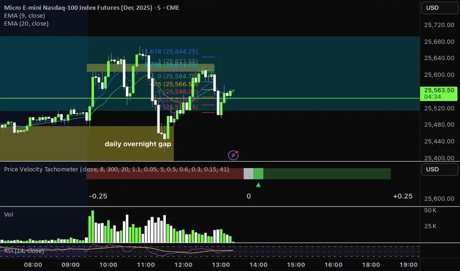 A visual gauge that breaks price action into a tachometer-style display, showing how fast price is moving up or down in real time. It measures price velocity in ticks per second and converts that momentum into an easy-to-read, center-zero meter—green when price accelerates upward, red when it accelerates downward. Ideal for spotting microbursts of momentum, shifts in pressure, and real-time strength behind each move.