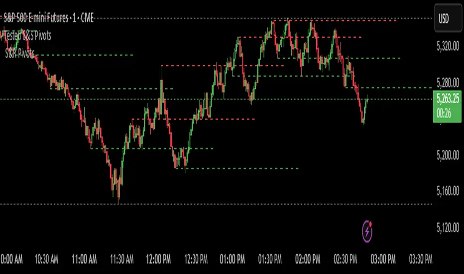 This indicator identifies and plots tested support and resistance levels using a filtered swing pivot strategy. It focuses on high-probability zones where price has reacted before, helping traders better anticipate future price behavior.