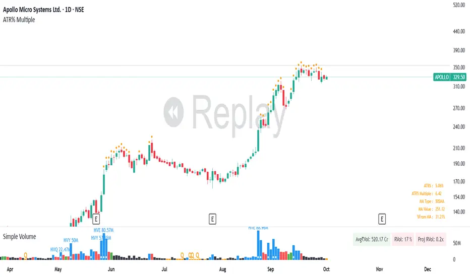 A lot of traders use ATR% multiple from 10DMA, 21EMA, 50SMA or 200SMA to determine how extended a stock is and accordingly sell partials or exit. By default the indicator takes 50SMA and when the ATR% multiple is greater than 7 then it gives the signal to take partials. You can back test this indicator with previous trades and determine the ideal threshold for the signal. For small and midcaps a threshold of 7 to 10 ATR% multiples from 50SMA is where partials can be taken while large caps can revert to mean even earlier at 3 to 5 ATR% multiples from 50SMA.