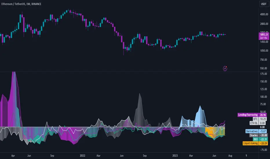 The indicator shows the pricing of 3 DEFI categories against 2 possible baselines, BTC and ETH.