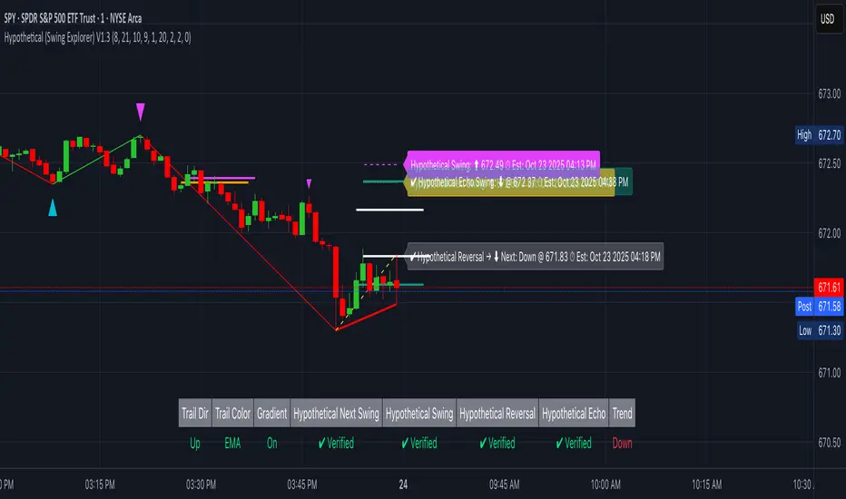 Hypothetical (Swing Explorer) V1.3 is a Pine v6 swing-study visualizer. It confirms extremes using ta.pivothigh/ta.pivotlow and an EMA context filter, then constructs a ZigZag only from verified pivots to avoid repainting. On top, it illustrates four hypothetical marks—Next, Swing, Reversal, and Forward Echo—each with an ETA derived from recent price speed and bar time. It also provides trail lines (verified or developing), an optional Zero-Lag guide from the last extreme, a status table showing hit/pending states, and optional custom candle coloring by leg.