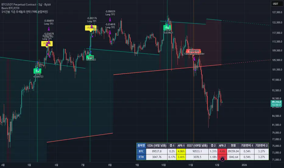 BTC, ETH의 선물 가격과 현물 가격의 차이(베이시스) 그리고 그 차이를 **연 환산 수익률(APR)**로 바꿔서 보여주는 표야.