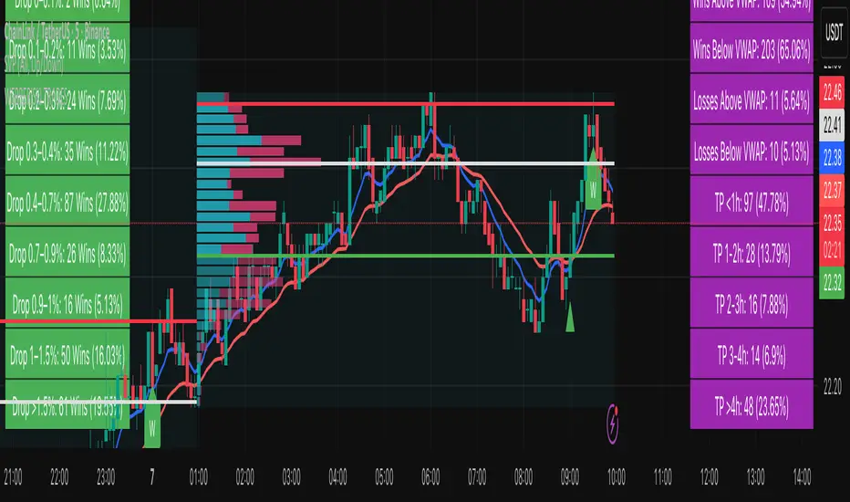 The WEBBERISKI indicator is a powerful tool designed for traders seeking to capitalize on short-term price movements in volatile markets. It generates buy signals based on a combination of RSI crossovers, EMA breakouts, and VWAP conditions, with customizable filters to restrict signals to prices above or below the anchored VWAP. The indicator tracks both active and ignored trades, providing detailed performance metrics, including win/loss percentages, drop percentages, and time-to-take-profit buckets (<1h, 1-2h, 2-3h, 3-4h, >4h). Visual labels (W, L, IW, IL) mark trade outcomes on the chart, while two tables display drop percentage distributions and comprehensive trade statistics, including VWAP-based win rates. Ideal for day traders and scalpers, WEBBERISKI offers flexible inputs for take-profit, stop-loss, and technical parameters to optimize trading strategies.