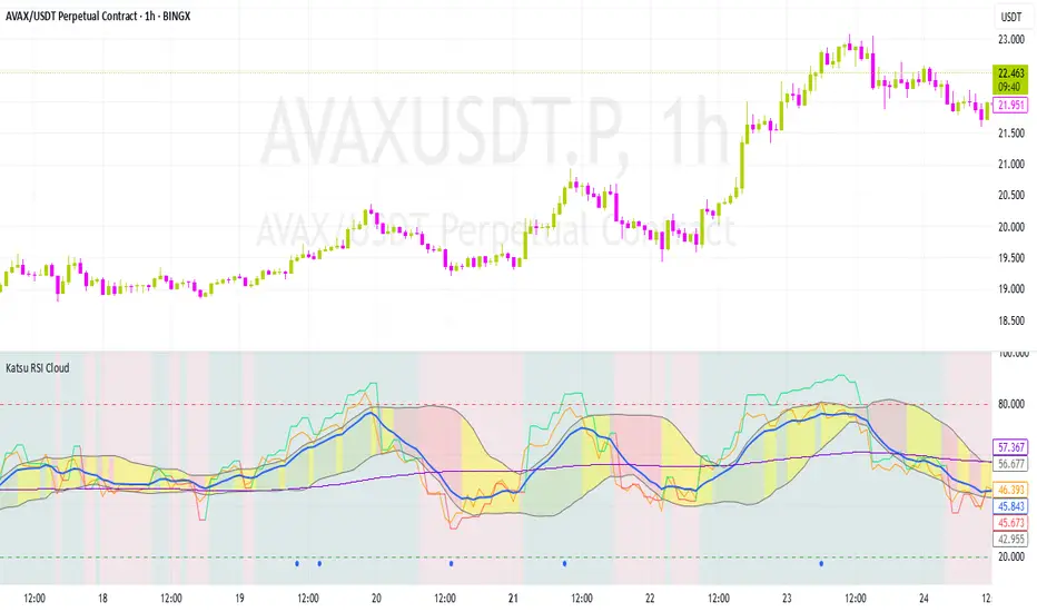 - Red: RSI is below the cloud → Strong bearish pressure, price well below the trend zone.