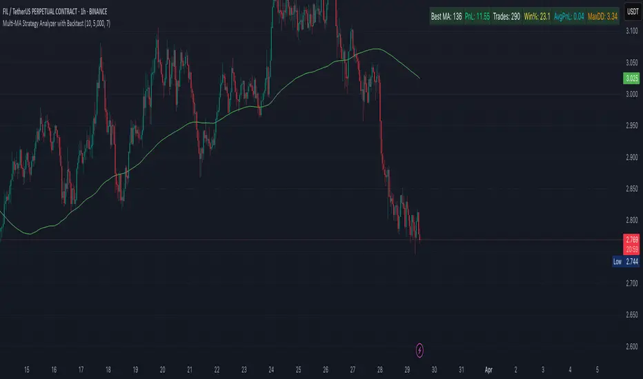 This TradingView Pine Script indicator is designed to analyze multiple moving averages (SMA or EMA) dynamically and identify the most profitable one based on historical performance.