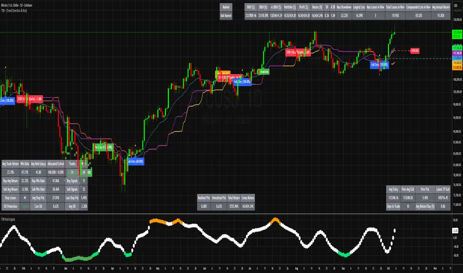 The TDR (Trend Direction & Risk) indicator is a comprehensive trend, risk, and trade management tool designed for active traders and portfolio managers. It combines advanced trend detection, dynamic risk zoning, and allocation-based trade simulation to help you identify optimal entry and exit points, manage risk, and track performance.
