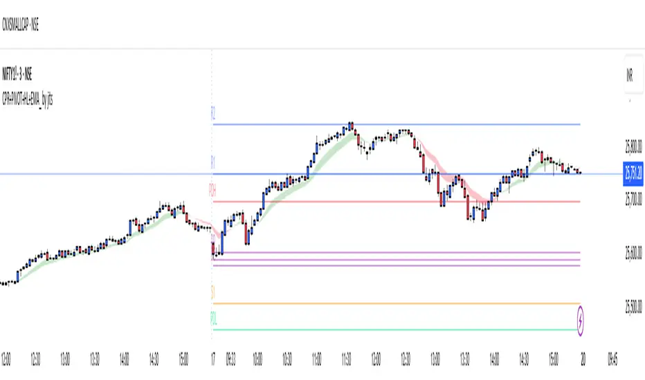 The **CPR+PIVOT+HL+EMA_ by Jit's** is a custom Trading View indicator designed especially for **index intraday trading** (like NIFTY, BANKNIFTY, and FINNIFTY). It integrates four powerful analytical components—Central Pivot Range (CPR), Pivot Points, Previous Day High/Low, and 9/15 Exponential Moving Averages (EMA)—to provide traders a comprehensive market structure and trend confirmation tool.