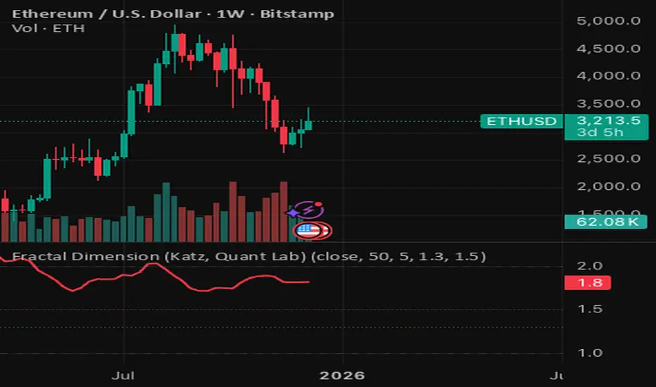 This indicator estimates the Katz Fractal Dimension of the price series over a rolling window.