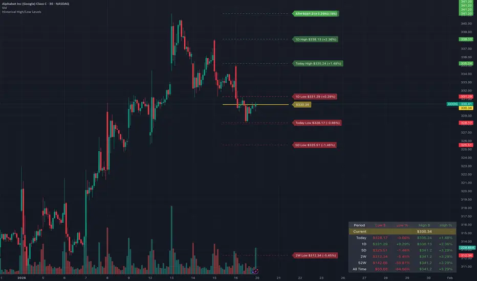 Visualize key historical support & resistance levels across multiple timeframes. Shows Today, Yesterday, 5D, 2W, 52W, and All-Time highs/lows with percentage distance from current price. Fully customizable with up to 10 configurable timeframes.
