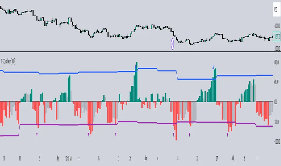 We can visualize this with an oscillator of sorts, where the zero line is anchored to the open price of the highest timeframe that we're concerned with. Using the prior example, this would be the 1D timeframe. As long as price is above the current 1D open, it is impossible to have FTFC down; and as long as price is below the current 1D open, it is impossible to have FTFC up. This is why we base the oscillator's values off of the highest timeframe's open (the values are simply how far price has traded from this open) - any value greater than zero tells us that there is potential to have FTFC up, and any value less than zero tells us that there is potential to have FTFC down.