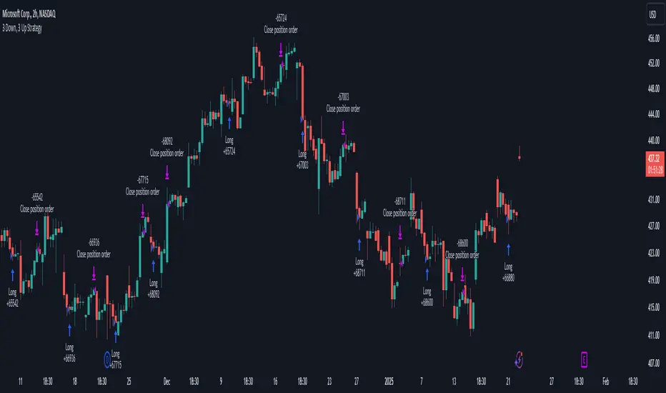 The "3 Down, 3 Up Strategy" is a mean-reversion strategy designed to capitalize on short-term price reversals. It enters a long position after consecutive bearish closes and exits after consecutive bullish closes. This strategy is NOT optimized and can be used on any timeframes.