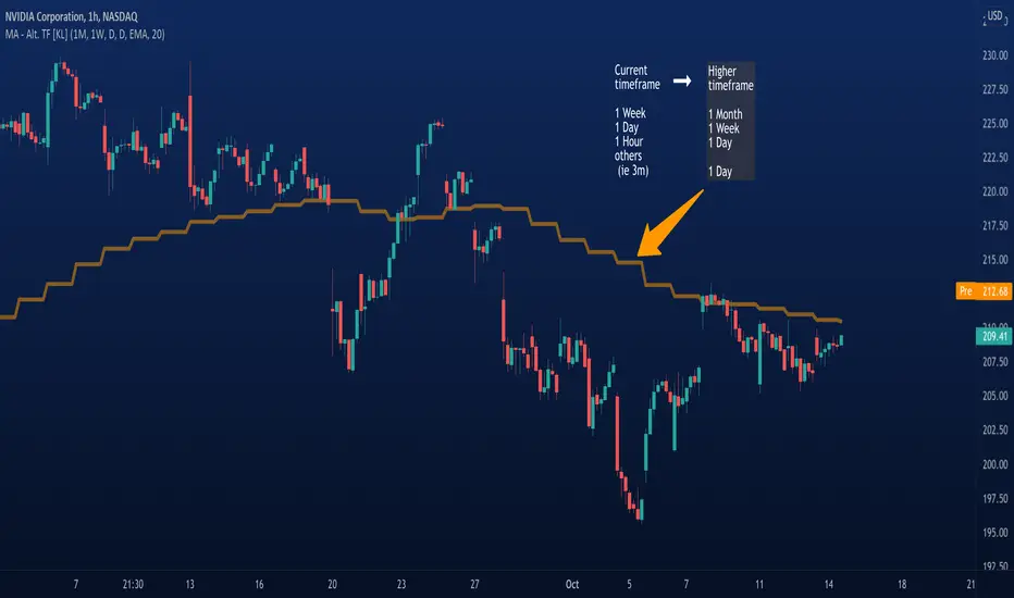 Say you are viewing an hourly chart but you also want to know the ema20 sourced from a higher timeframe (i.e daily) of the same security. The problem with using most built-in indicators is that the MA values are usually calculated from the current chart, so to do that, you will have to toggle between 1h/1D. This script will eliminate this hassle by plotting out the desired alternative timeframe on the same chart.