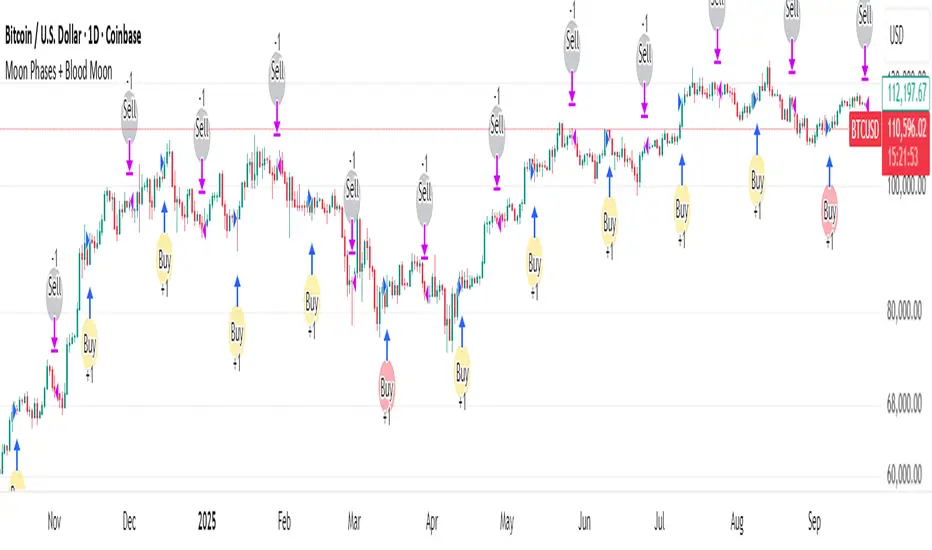 This is a simple, time-based strategy that goes long on full moons and exits on the next new moon, while visually highlighting historically known “Blood Moon” (total lunar eclipse) dates. It’s built for exploratory testing of lunar timing effects on price, not for predictive claims.