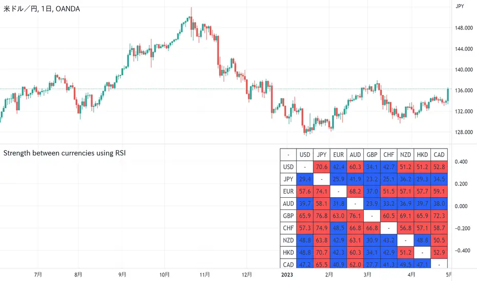 If the RSI between currencies is greater than or equal to 50, it will have a red background, and if it is less than 50, it will have a blue background.